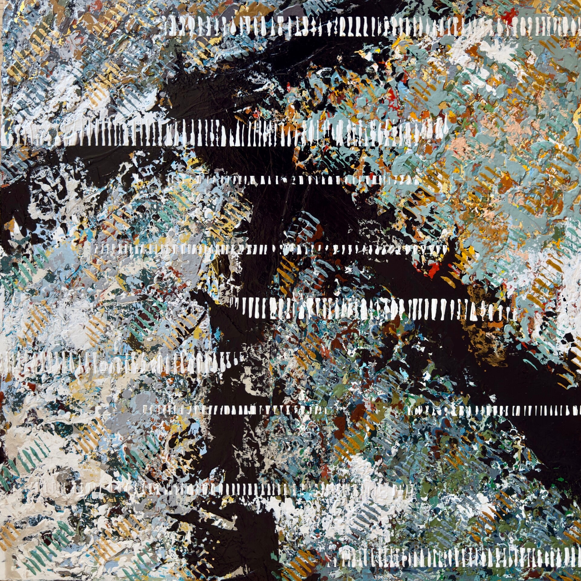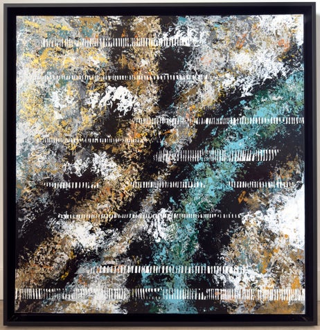 Le tableau donne l’impression d’un espace qui s’étend, évoquant un territoire vaste, presque désertique. Les couleurs circulent librement, et certains reflets dorés renforcent une impression de paysage lumineux, exposé et traversé. Jamais figé.